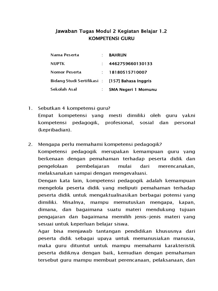Tugas M2 Kb1 Docx Tugas M2 Kb1 2 Kompetensi Guru 1 Ada 4 Kompetensi Yang Harus Dimiliki Guru A Kompetensi Pedagogik Merupakan Kemampuan Guru Dengan Course Hero