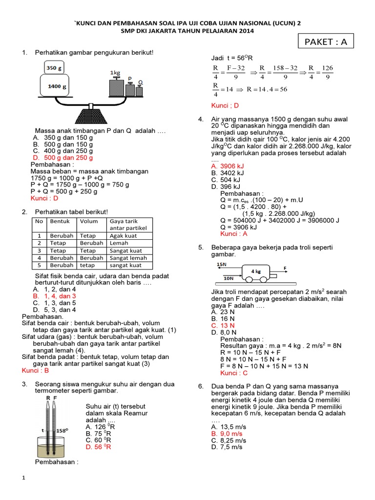 Jika mau anda bisa mendownload Soal UCUN UJI COBA UN SMP DKI Tahun 2017. Naskah soal UCUN DKI 2016 Tahap 2 ini akan dijadikan satu file yang memuat 4 pelajaran SMPMTs yaitu Bahasa Indonesia Bahasa Inggris Matematika dan IPA. KUNCI JAWABAN DAN PEMBAHASAN UCUN 1 PAKET A SMPMTs MATA PELAJARAN ILMU PENGETAHUAN ALAM IPA TAHUN PELAJARAN 20152016 No Materi Materi yang diujikan Kunci Jawaban 1 Besaran dan Pengukuran Membaca hasil.