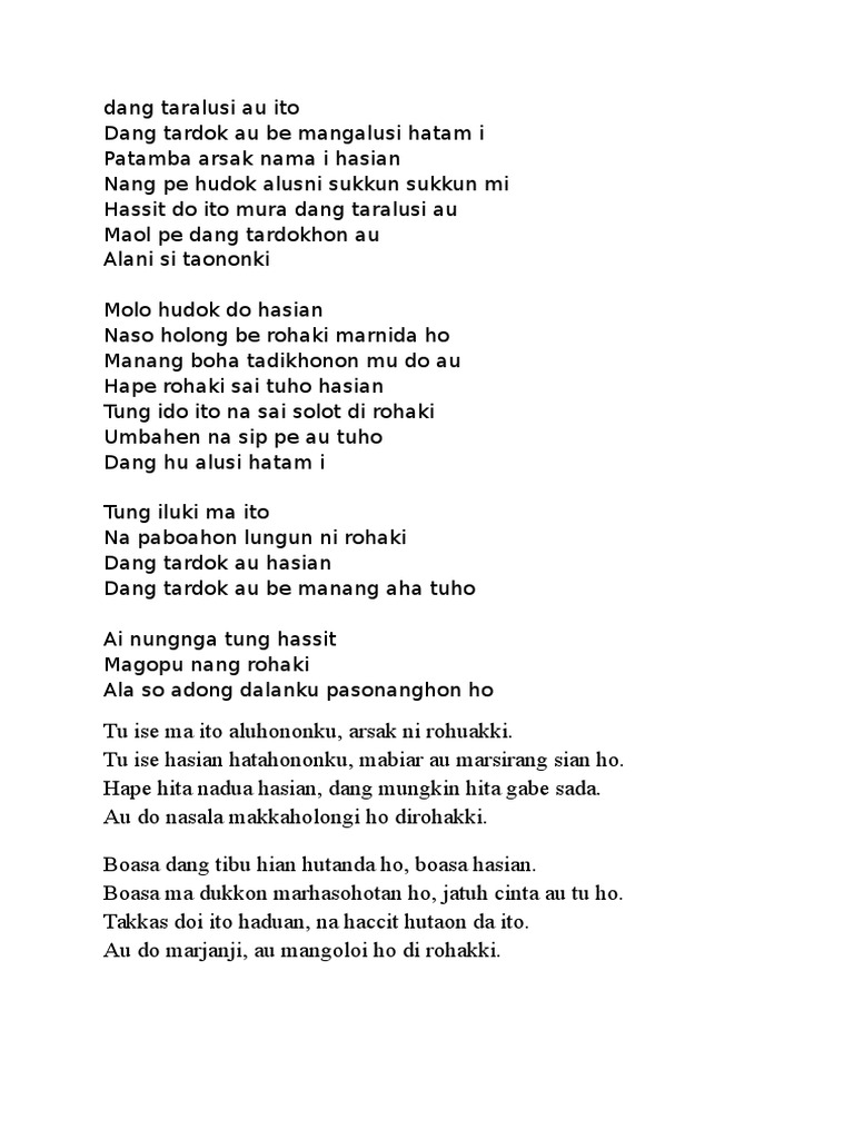 Tu ise ma ito aluhononku arsak ni rohakki Tu ise hasian hatahononku mabiar au marsirang sian ho Hape hita nadua hasian dang mungkin hita gabe sada Au do nasala makkaholongi ho dirohakki Boasa dang tibu hian hutanda ho boasa hasian Boasa ma dukkon marhasohotan ho jatuh cinta au tu ho Takkas doi ito haduan na haccit hutaon da ito Au do marjanji au mangoloi ho di rohakki Hape ro ma. Boasa dang tibu hian hutanda ho boasa hasian. D Boasa dang tibu hian hutanda ho.