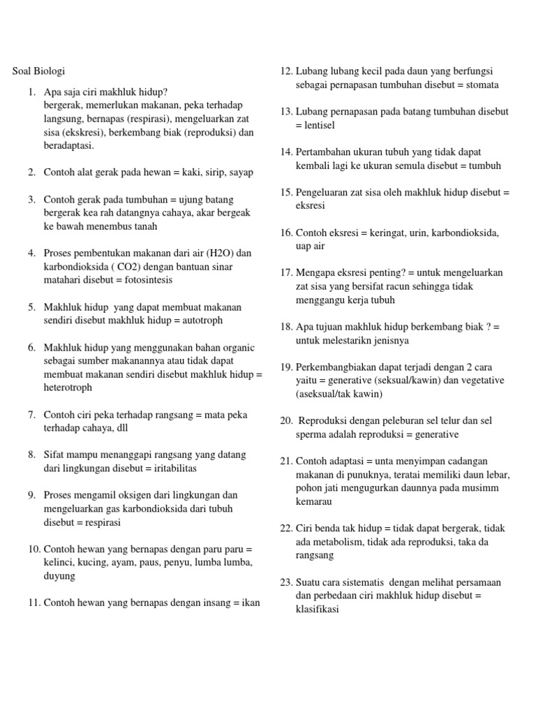 Bernapas atau respirasi merupakan proses mengambil oksigen dari lingkungan dan mengeluarkan gas karbon dioksida dari tubuh. Alat pernapasan setiap makhluk hidup tidaklah sama pada hewan invertebrata memilki alat pernapasan dan mekanisme pernapasan yang berbeda dengan hewan vertebrata Waluyo 2010. Reproduksi pada mahluk hidup dapat terjadi secara generative maupun vegetative repropuksi dipengaruhi oleh faktor dalam yakni saraf dan juga hormon reproduksi juga dipengaruhi oleh beberapa faktor eksternal yaitu suhu lingkunganmakanan dan potoperioditas Tujuan reproduksi mahluk hidup Ciri-ciri mahluk hidup 1.