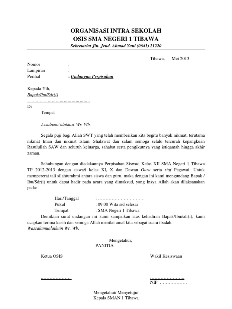27 Dusun Paraan Desa Plosorejo Kecamatan Kademangan Kabupaten Blitar Kepada Yang Terhormat. SISWA KELAS XII TAHUN 2014 2015 SMK BINA ISLAM MANDIRI KERSANA 1. Contoh Surat Undangan Perpisahan Sekolah kelas 6 Oleh SHIJI Agustus 21 2019 Membuat Surat Undangan Perpisahan Sekolah pada dasarnya sama dengan undangan lainnya.