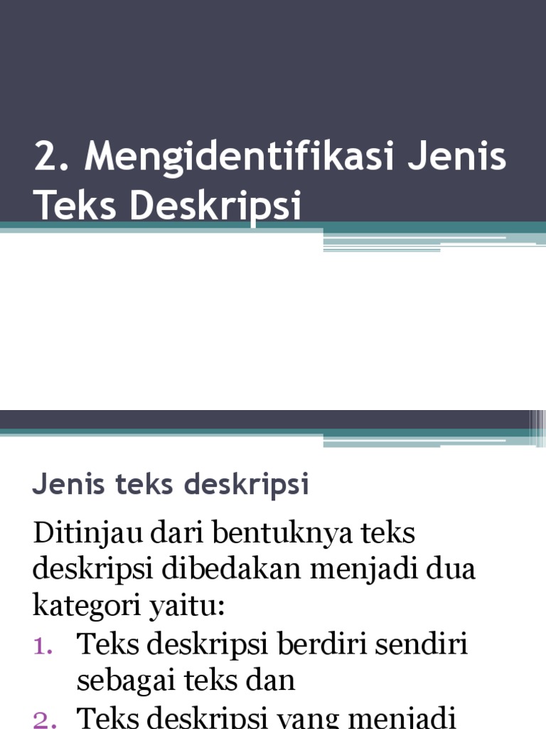 Ditinjau dari bentuknya teks deskripsi dibedakan menjadi dua kategori yaitu teks deskripsi berdiri sendiri sebagai teks dan teks deskripsi yang menjadi bagian teks lain cerpen novel lagu iklan dll. Jenis Teks Deskripsi. Ditinjau dari bentuknya teks deskripsi dibedakan menjadi dua kategori yaitu teks deskripsi yang berdiri sendiri sebagai teks dan teks deskripsi yang menjadi bagian teks lain cerpen novel lagu iklan dll.