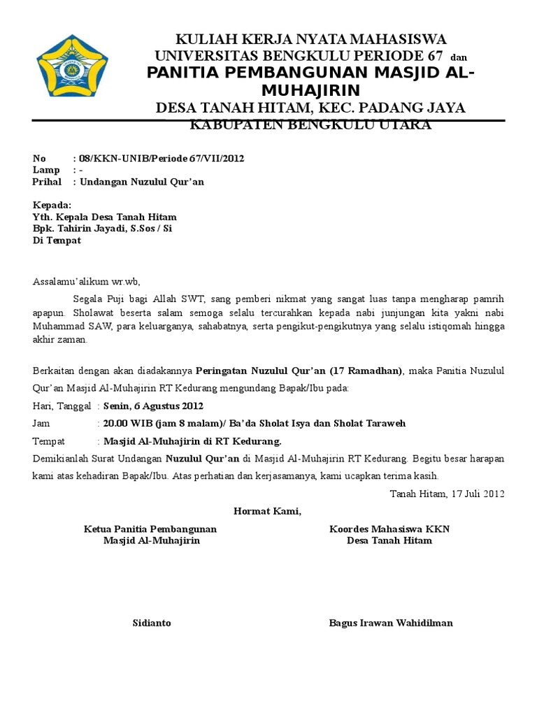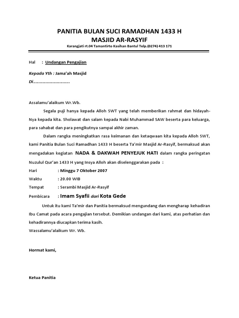 Download Contoh Surat Undangan Pengajian Terbaru. Surat Undangan Rapat RT. UNDANGAN NUZULUL QURAN di Masjid Attaqwa KpPanecekan DsKubangpuji KecPontang Kab.