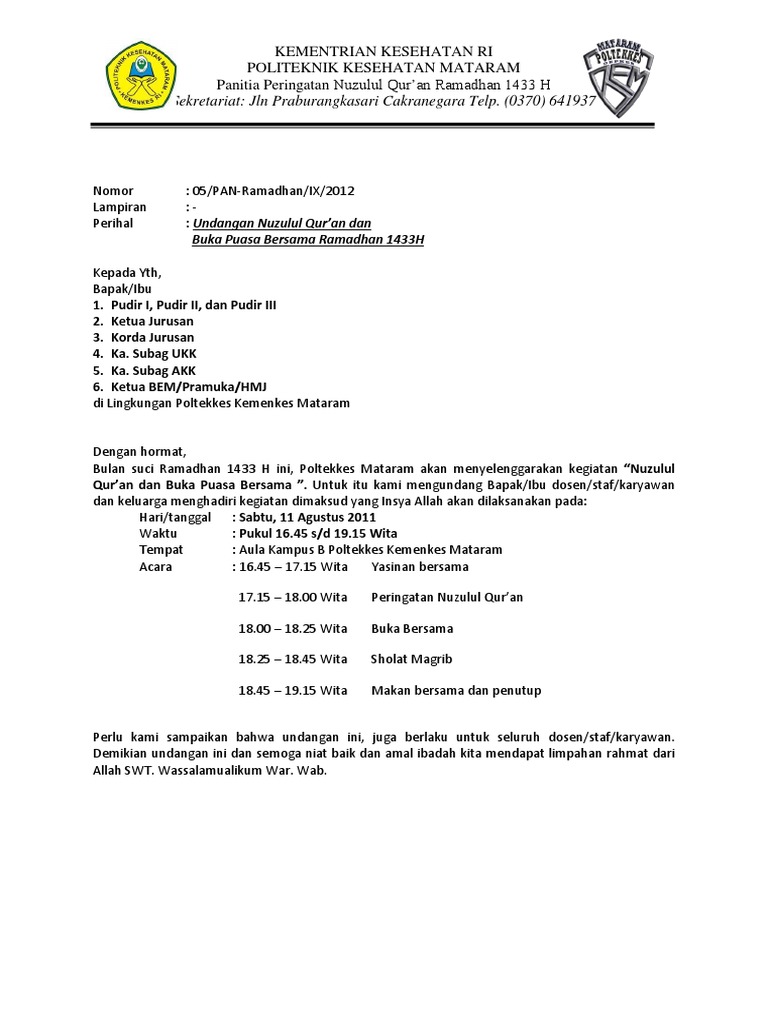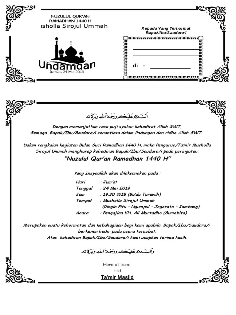 Beberapa Contoh Surat Undangan Khotmil Qur An Terbaik 2019. Home BERITA PENGUMUMAN Undangan Nuzulul Quran 1440 H. 20 contoh surat undangan.